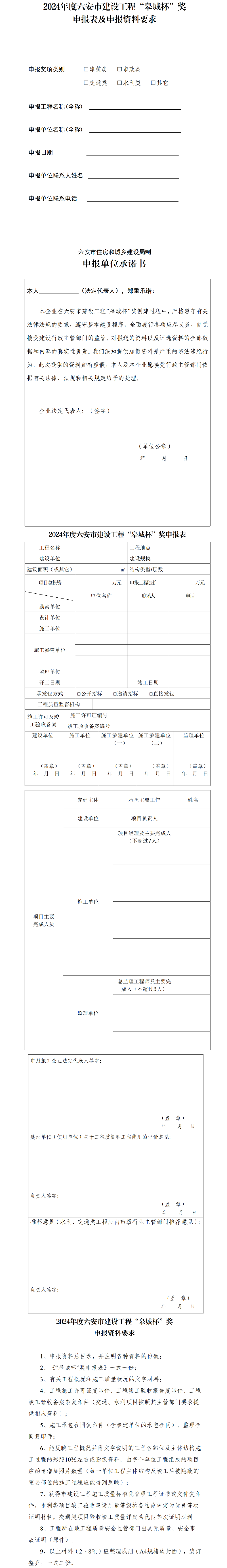 附件:2024年度六安市建设工程“皋城杯奖”申报表及申报要求
