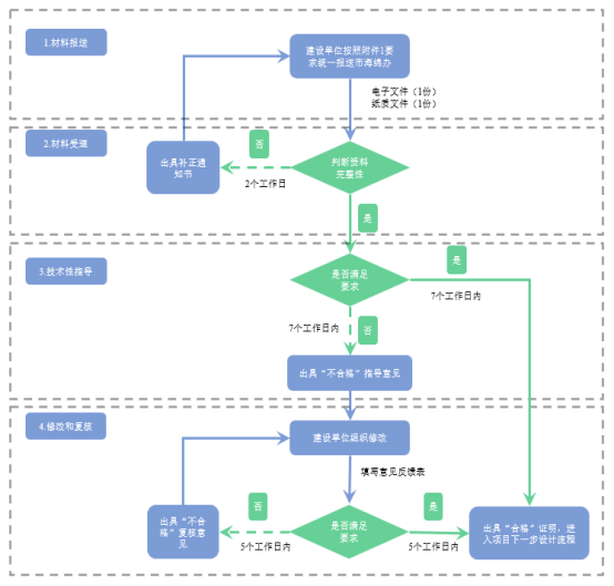 市海绵办根据《方案设计阶段报送材料清单表》要求判断报送材料是否完整。如报送材料不满足完整性要求,市海绵办2个工作日内出具《补正通知书》(详见附件3),并发送至建设单位邮箱;如报送材料完整,市海绵办将受理材料并对建设单位进行技术性指导。