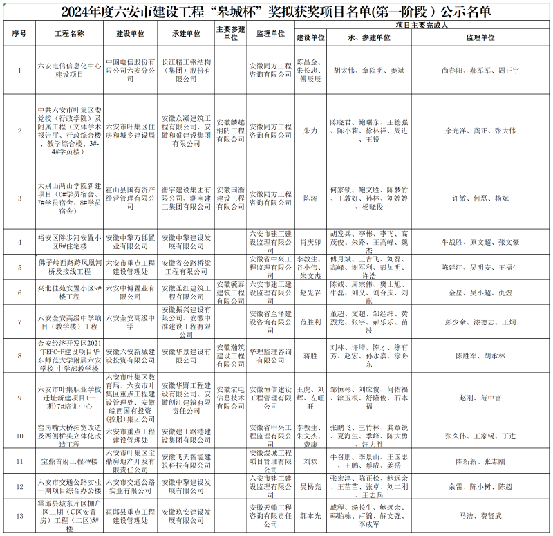 关于2024年度六安市建设工程“皋城杯”奖第一阶段拟通过项目名单的公示