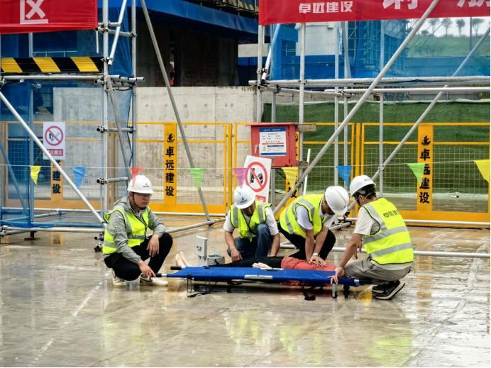 本次应急演练共设置高空坠落事故应急演练、防触电事故应急演练2个应急演练项目。通过模拟真实施工环境中可能遇到的各种紧急情况,以检验和提升工地人员的应急响应能力和安全操作技能。在高处坠落演练中,模拟的是施工现场一名工人突然从脚手架上坠落至地面。监理人员发现人员坠落后立即向应急小组组长报告,拨打120请求救援,按照医护人员指示照护受伤人员,并拨打区UED体育 电话,汇报事故有关情况。同时立即通知各救援小组赶赴现场启动应急预案,立即停止现场施工作业,封锁事故现场,注意保护好坠落人员,防止造成二次伤害。120救护车在救援组人员的带领下来到工地,直接进入事故现场检查伤员受伤情况。经医护人员包扎处理后,迅速将高处坠落人员用担架抬上救护车送往医院救治,事故调查组和架子工对现场脚手架进行了加固处理。在防触电事故演练中,模拟的是项目施工现场钢筋加工区内,一名钢筋工移动手持电钻时,因电缆破损触碰金属支架,突然倒地抽搐,电钻仍在运转,情况危急。目击者发现后,立即寻找附近干燥木棍将电钻的电缆线从伤员身上挑开。 随后,电工和班组长闻讯跑来,电工迅速跑至配电箱,断开对应电源,并挂牌“禁止合闸”;班组长立即向栋号长汇报事故情况。同时立即拨打120请求救援,按照医护人员指示照护受伤人员,并拨打区UED体育 电话,汇报事故有关情况。通知各救援小组赶赴现场启动应急预案,警戒保卫组带领组员使用警戒带将危险区域进行封闭,同时把守警戒区,禁止无关人员围观并保护事故现场。