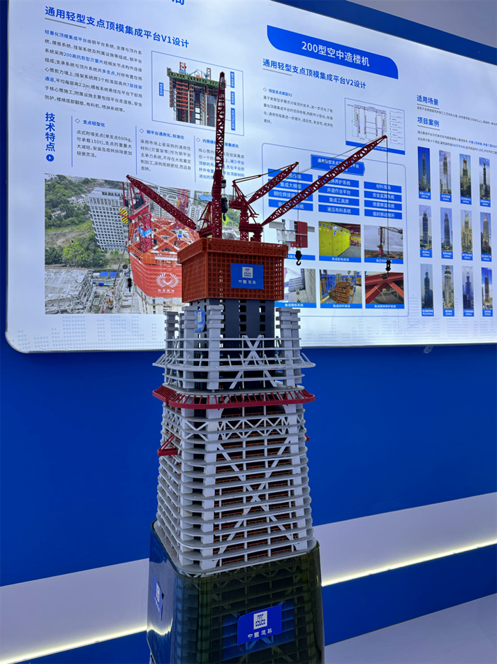 新型农宅的背后,体现的是装配式建筑、超低能耗建筑、智能建筑在当下的高水平应用。而在名为“大国重器”的展位上,空中造楼机、住宅造楼机、轻型造楼机等一众重磅产品通过模型和视频演示等方式呈现在观展观众眼前。中建三局工作人员武少华表示,如果说装配式建造方式是将工厂安置于工地之外,造楼机的出世,可以说是将施工现场直接变为工厂,实现智能化建造。