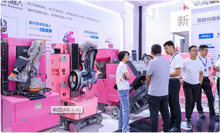 如果说造楼机是个在建造领域智能高效的“大家伙”,那么建筑机器人则可谓是建设过程中灵活机动的“多面手”。在一旁的展位上,来自4家单位的13台实体建筑机器人正向公众展示自己的强悍实力。一家来自广东的建筑机器人公司市场服务部总经理杜晓伟表示,地面整平、混凝土抹光、腻子涂敷、室内喷涂、地坪研磨、外墙喷涂等一系列“危、繁、脏、重”的体力活儿,如今完全可以被机器人代劳。