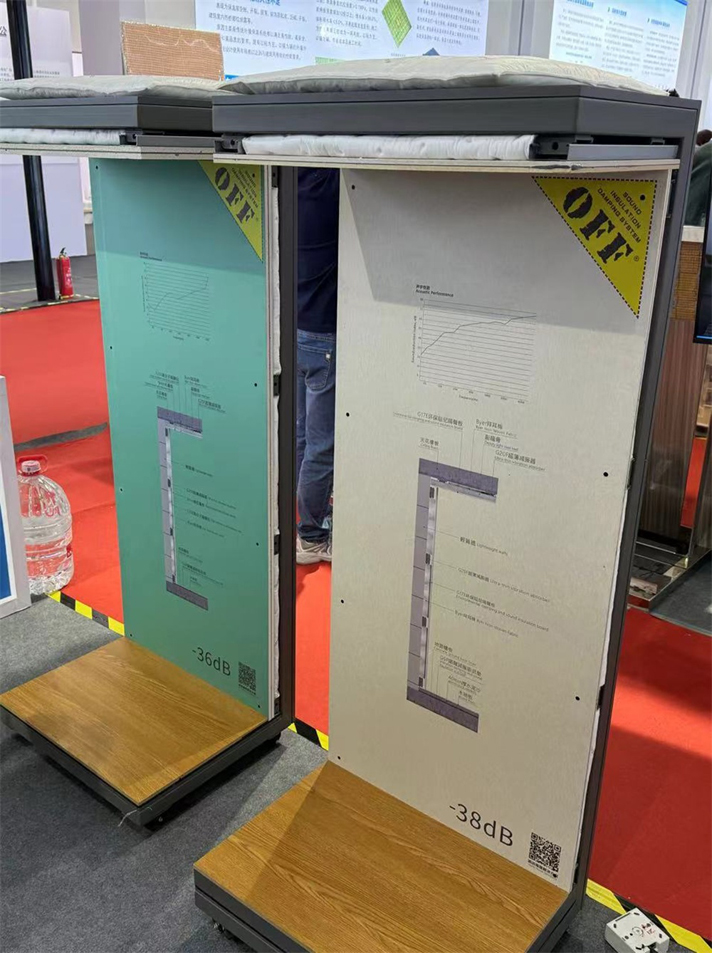 刘娜:墙、顶、地,我们房屋有6面,以前大家是凭着传统的装修方式来解决,可能认为吸音棉能够隔音,其实吸音棉的孔隙非常疏松。我们是做在结构里面,放到空腔里,做一个减震器,在空腔里填棉,外边要复合石膏板加上隔声毡,再加上复合板,做成“三明治”的结构,多层结构才能达到隔声效果。我们墙、顶、地,按照这种方式来做的话,能够达到隔声量36分贝,旁边的那个方式是38分贝,办公室或者家庭里面如果能达到30多分贝,就已经极其安静了。