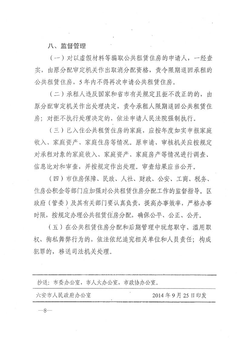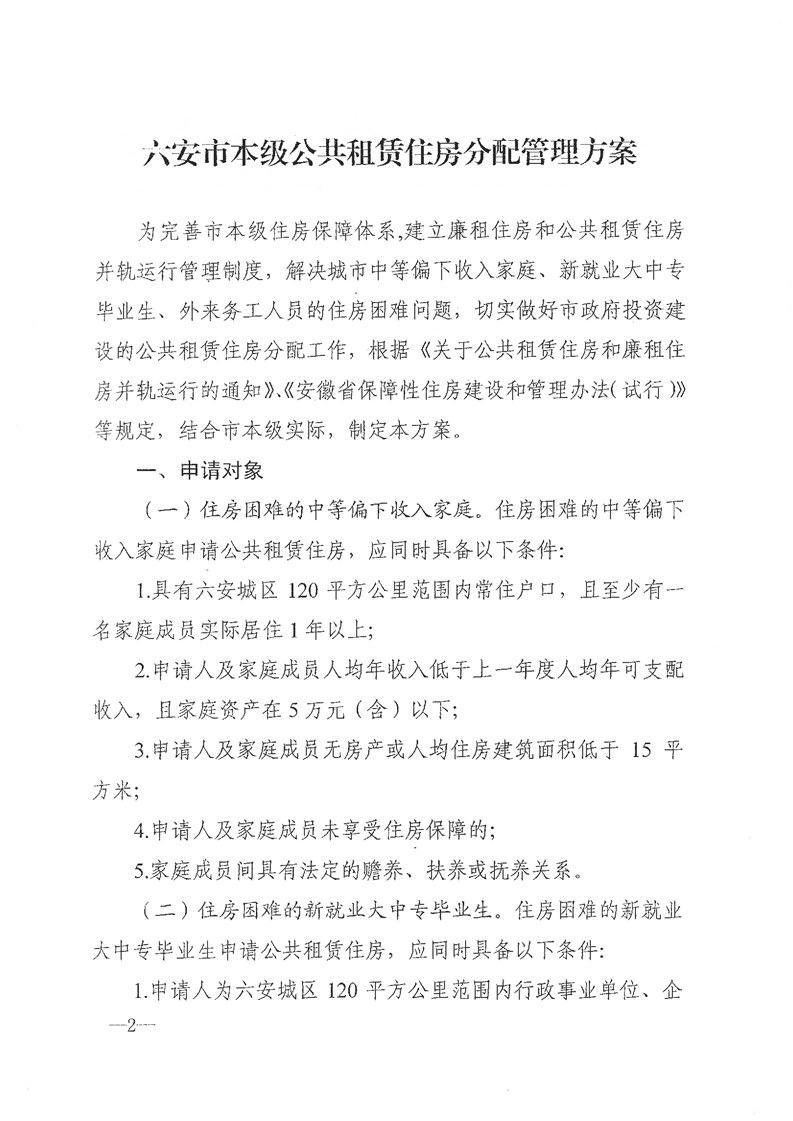 关于印发六安市本级公共租赁住房分配管理方案的通知(内含住房保障政策、分配对象、分配程序、监督管理等信息)